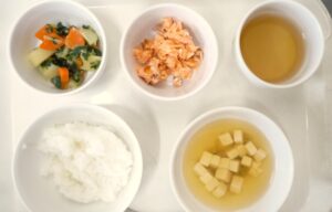 離乳食(後期)昼食:軟飯、鮭の塩こうじ焼き、ほうれん草のごま和え、すまし汁