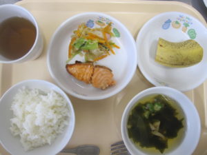 昼食:ご飯、鮭の塩こうじ焼き、千草和え、すまし汁(わかめ、しめじ、おくら)、バナナ(乳児のみ)、麦茶