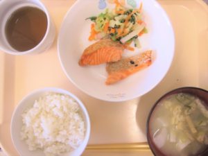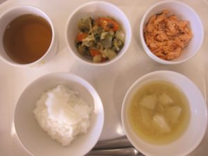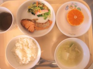昼食:ご飯、鮭の塩こうじ焼き、千草和え、みそ汁(油揚げ、里芋、長ねぎ)、みかん(乳児のみ)、麦茶