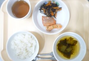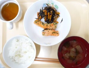 昼食:ごはん、鮭の香り焼き、ひじき煮、すまし汁(冬瓜、わかめ、万能ねぎ)、麦茶