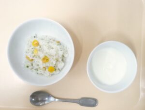 おやつ(後期)とうもろこしごはん(粥)、麦茶