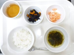 昼食(後期):ごはん(粥)、鮭のみそ焼き、ひじき煮、すまし汁、麦茶