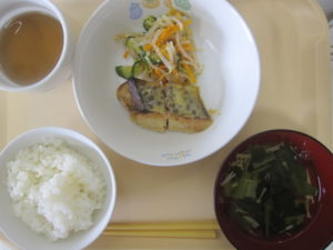 昼食:ご飯、鰆の西京焼き、もやしの胡麻酢和え、すまし汁(えのき、小松菜)、りんご(乳児のみ)、麦茶