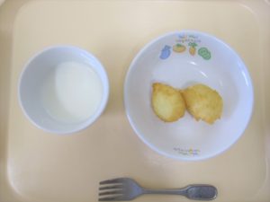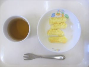 離乳食(後期)午後おやつ:麦茶、豆腐パンケーキ