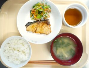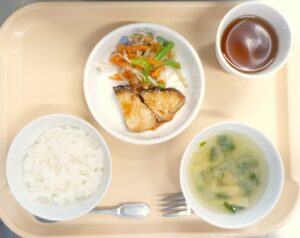 昼食:ごはん、ぶりのかば焼き、 もやしの胡麻酢和え、みそ汁、麦茶