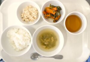 離乳食後期の昼食: 軟飯、かじきの照り焼き、ごまあえ、みそ汁、麦茶