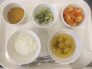 昼食:ご飯、鶏のケチャップ煮、ベイクドポテト、かぶのスープ(かぶ、長ねぎ、ベーコン)、りんご(乳児のみ)、麦茶