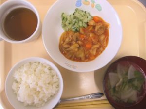 昼食:ごはん、鶏のケチャップ煮、ベイクドポテト、かぶのスープ、りんご(乳児のみ)、麦茶