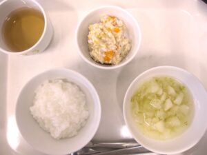 離乳食(中期)午前食:おかゆ、野菜のそぼろあん、かぶのスープ