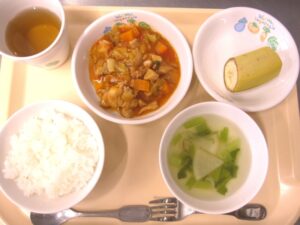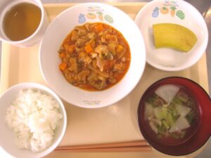 昼食:ごはん、鶏のケチャップ煮、かぶのスープ(かぶ、ベーコン、長ねぎ)、バナナ、麦茶