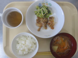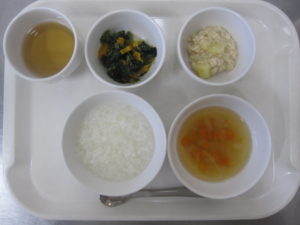 昼食:ご飯、鶏のマーマレード焼き、ごま和え、スープ(じゃがいも、人参、玉ねぎ)、りんご、麦茶