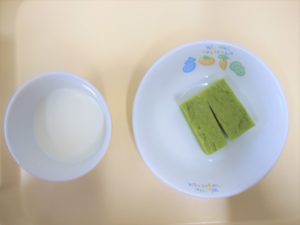 午後おやつ:牛乳、抹茶蒸しパン