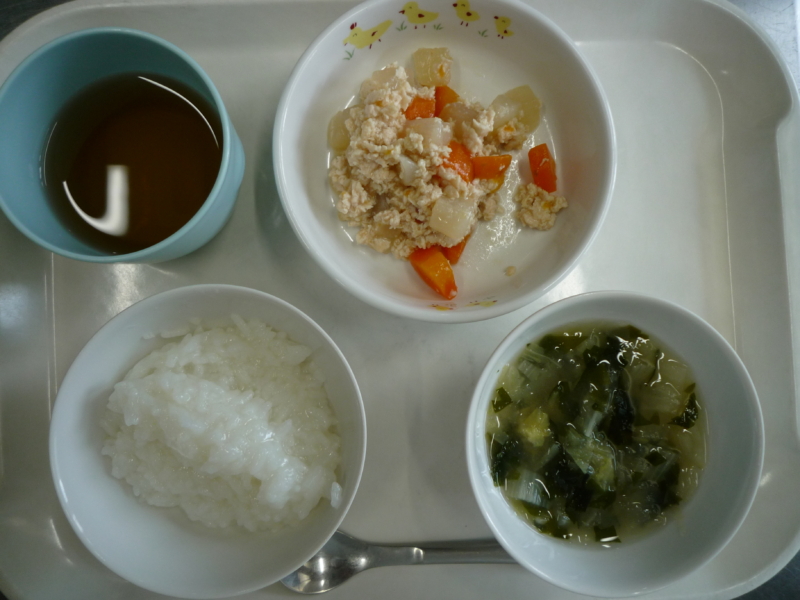 離乳食(後期)昼食:おかゆ、鶏ひき肉と野菜煮、みそ汁、麦茶