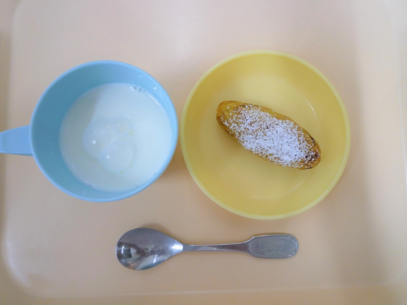昼食:ご飯、鶏のからあげ、大根の甘酢漬け、みそ汁(白菜、わかめ)、みかん(乳児のみ)、麦茶