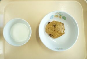 午後おやつ:黒糖米粉蒸しパン、牛乳