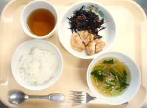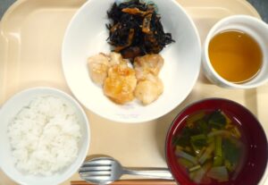 昼食:ごはん、鶏の照り焼き、ひじきの炒り煮、すまし汁(小松菜、えのき、玉ねぎ)、麦茶