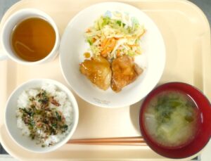 昼食:ごはん、鶏の照り焼き、キャベツのしらすあえ、みそ汁