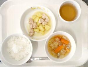 昼食:ごはん、鶏肉とさつまいもの味噌炒め、豚肉と白菜のスープ、みかん、麦茶