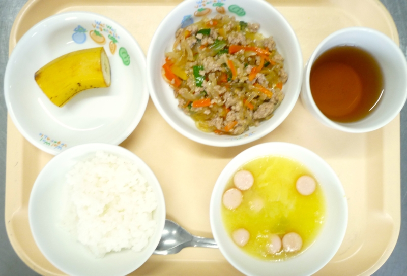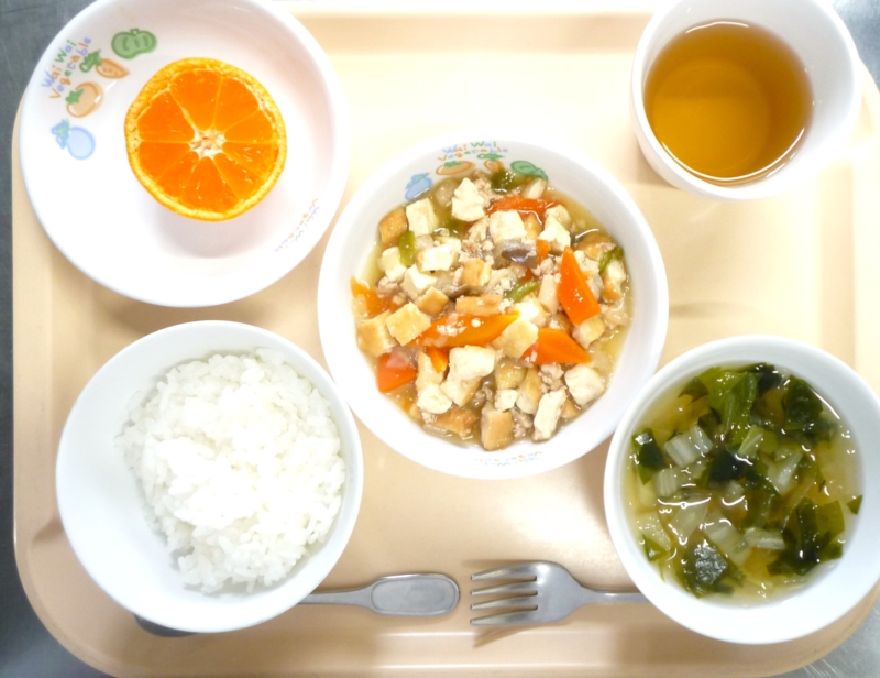 昼食:ごはん、鶏肉とさつまいもの味噌炒め、豚肉と白菜のスープ、みかん、麦茶