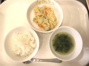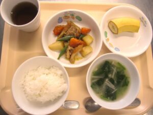 昼食:ご飯、鶏肉とじゃがいものごま煮、みそ汁(ほうれん草、えのき)、バナナ、麦茶