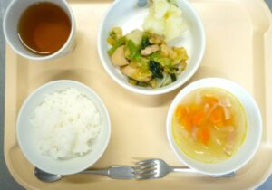 昼食:鶏肉とキャベツのソテー、粉ふき芋、スープ、ごはん、麦茶