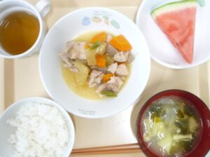 昼食:ごはん、鶏肉と冬瓜の煮物、和風スープ(油揚げ、わかめ、玉ねぎ、じゃがいも)、すいか、麦茶