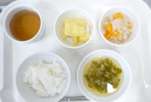 離乳食(後期)昼食:ごはん、冬瓜のそぼろ煮、じゃが芋煮、すまし汁