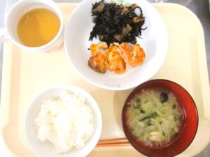 昼食:ご飯、鶏肉のあかね焼き、ひじきの炒り煮、みそ汁(切干大根、万能ねぎ、しめじ)、すいか(乳児のみ)、麦茶