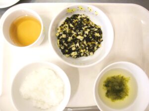 離乳食(中期)午前食:おかゆ、高野豆腐とひじきの煮物、スープ