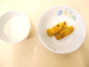 午後おやつ:牛乳、かぼちゃケーキ