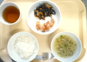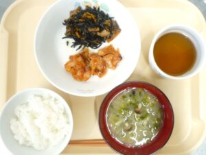昼食:ごはん、鶏肉のあかね焼き、ひじきの炒り煮、みそ汁(切干大根、万能ねぎ、しめじ)、麦茶