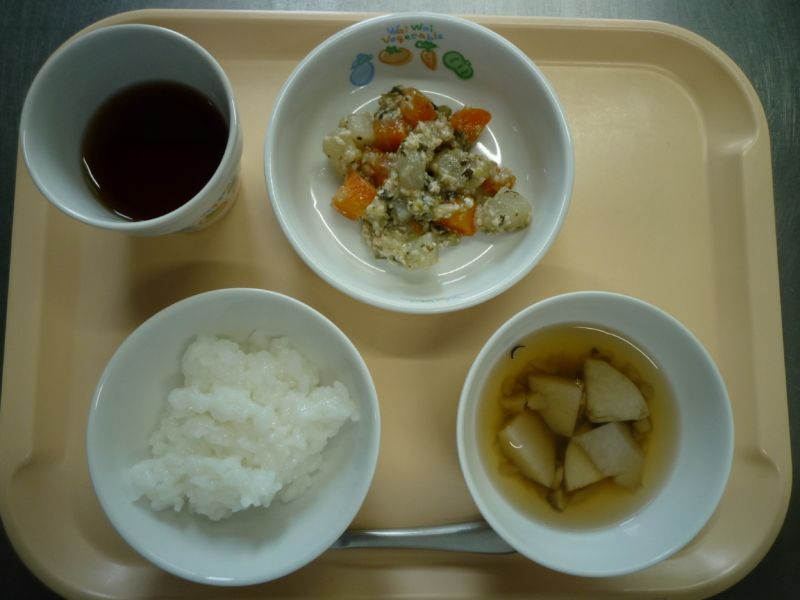 離乳食(後期)昼食:野菜のそぼろ煮、すまし汁、麦茶
