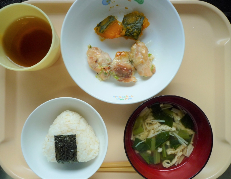 昼食:ご飯、鶏肉のねぎ塩焼き、かぼちゃ煮、きつねスープ、りんご(乳児のみ)、麦茶