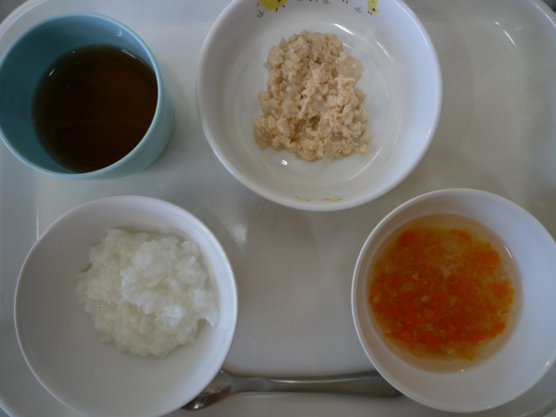 離乳食(中期)午前食:おかゆ、大根のそぼろ煮、芋煮