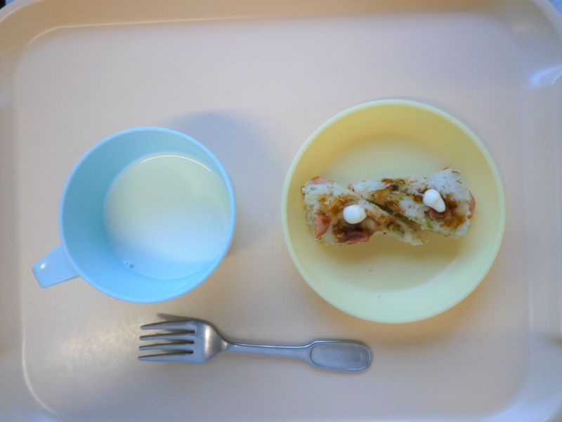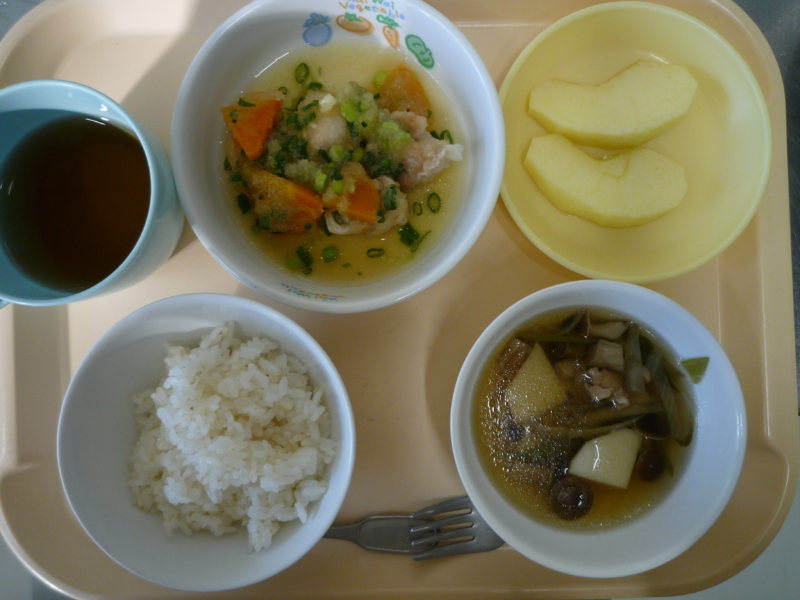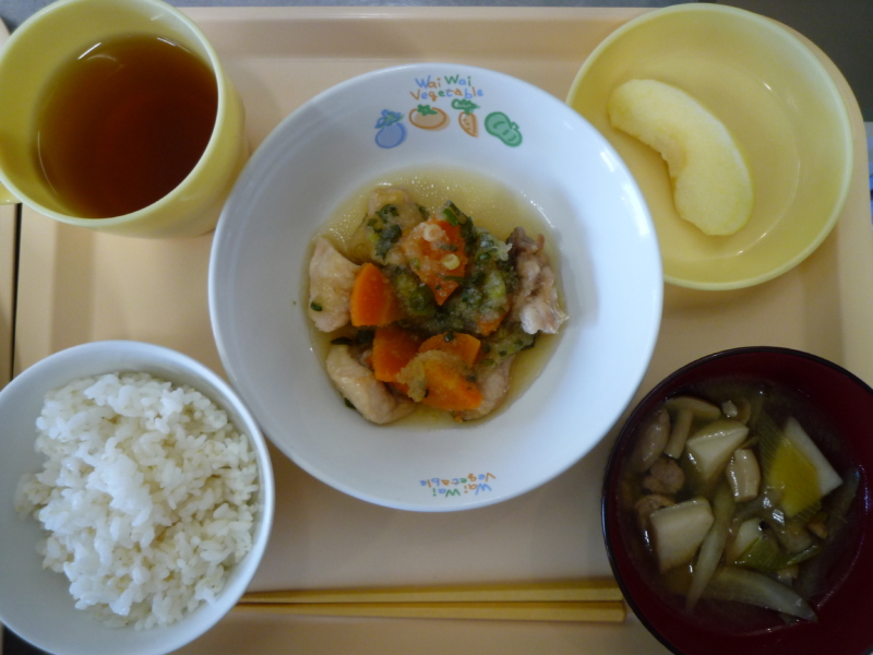 昼食:ご飯、鶏肉のみぞれあん、芋煮(里芋、長ねぎ、しめじ、ごぼう)、りんご、麦茶
