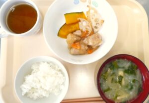 昼食:ごはん、鶏肉のみぞれ煮、焼き野菜、みそ汁