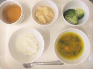 昼食:ご飯、鶏肉のみぞれ煮、焼きかぼちゃ・ブロッコリー、みそ汁(もやし、万能ねぎ、油揚げ)、みかん(乳児のみ)、麦茶