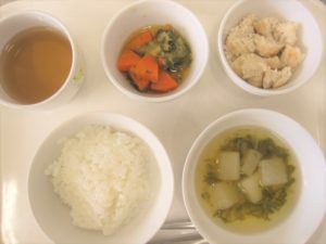 昼食:ご飯、鶏肉のチリソース炒め、チンゲン菜の中華炒め、スープ(大根、水菜、ベーコン)、りんご(乳児のみ)、麦茶
