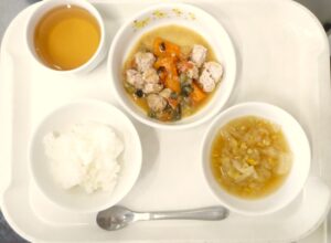 離乳食(後期)昼食:おかゆまたは軟飯、鶏つくねのトマト煮、キャベツスープ、麦茶