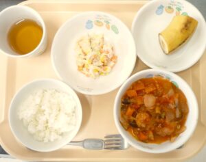 昼食:ごはん、鶏肉のトマト煮、コールスローサラダ、バナナ、麦茶