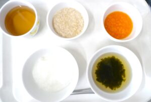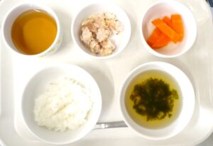 離乳食(中期)午前食:おかゆ、キャベツとつくね煮、にんじんのおひたし、スープ