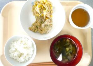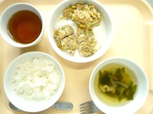 昼食:ごはん、鶏肉のパン粉焼き、ツナサラダ、スープ(わかめ、玉ねぎ、しめじ)、麦茶