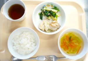 昼食:ごはん、鶏肉のマヨ焼き、小松菜のソテー、スープ(きゃべつ、人参)
