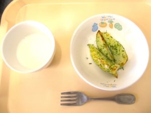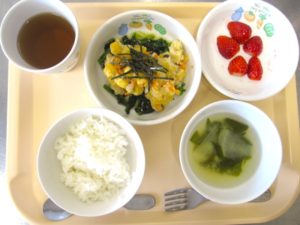 昼食:ごはん、鶏肉と凍り豆腐の重ね煮、小松菜のおひたし、みそ汁(大根、わかめ)、いちご(乳児のみ)、麦茶
