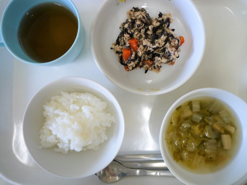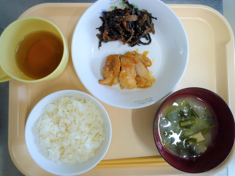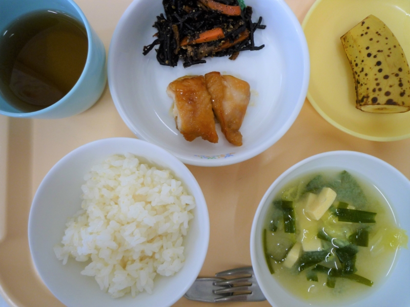昼食:ご飯、鶏肉の照り焼き、ひじきの炒り煮、みそ汁(白菜、にら、凍り豆腐)、バナナ(乳児のみ)、麦茶