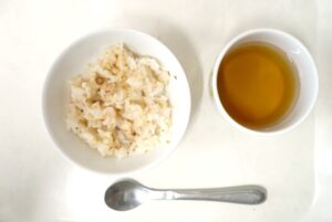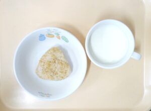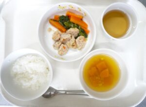 離乳食後期の昼食:軟飯、鶏つくねと野菜煮、かぼちゃのスープ、麦茶