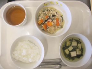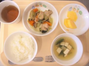 昼食:ごはん、鶏肉の酢醬油煮、スープ(豆腐、にら、えのき)、柿、麦茶