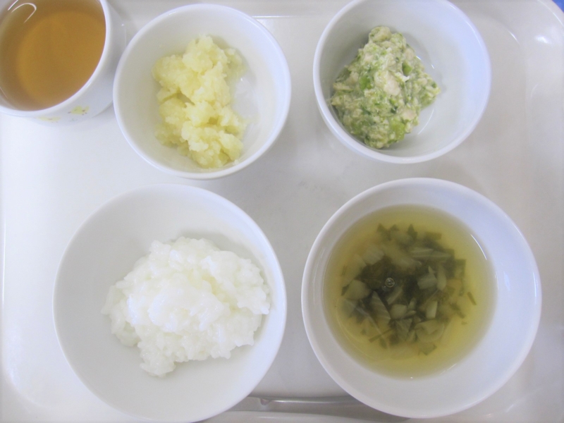 離乳食(中期)午前食:おかゆ、ささみのとろ煮、ふかしいも、すまし汁