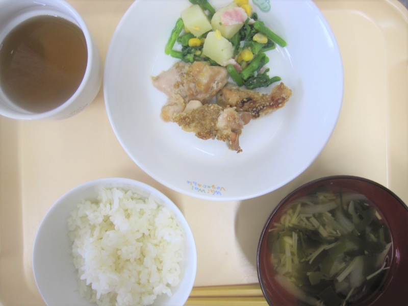 昼食:ご飯、鶏肉の醤油こうじ焼き、ほうれん草サラダ(ほうれん草、じゃがいも、ベーコン、コーン)、すまし汁(わかめ、玉ねぎ、えのき)、バナナ(乳児のみ)、麦茶