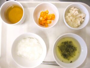 離乳食(中期)午前食:お粥、鶏つくね煮、おひたし、すまし汁